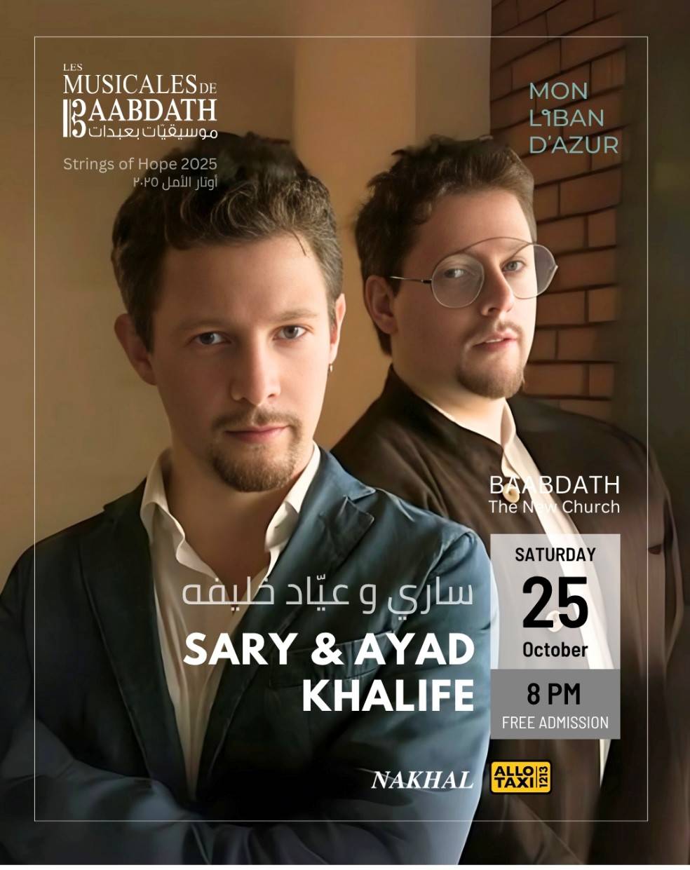 أما العازفان التوأمان ساري وعيّاد خليفة، فيُقدّمان أمسية 25 أكتوبر من فعاليات المهرجان، ببرنامج مؤلَّف من مقطوعات موسيقية على آلتَي البيانو والتشيلو من تأليفهما، مُطعّمة بنفحات شرقية، إلى جانب مقطوعات معروفة لعازفين عالميين. ويُخصّصان لفتة تكريمية للموسيقي الراحل بوغوص جلاليان.