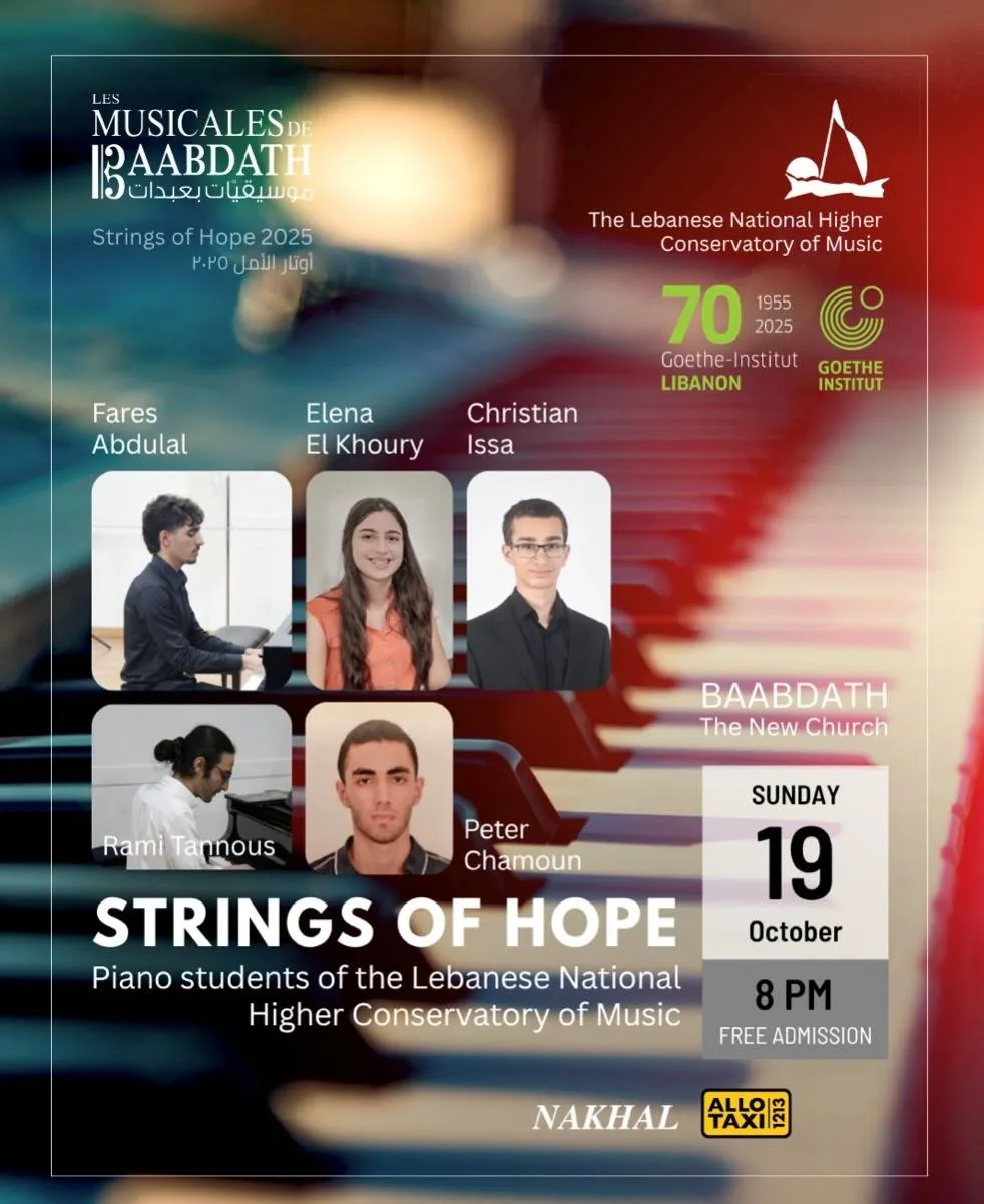 في الدورة السابعة لهذا الحدث، التي تُقام تحت عنوان «أوتار الأمل»، تُنظَّم 7 حفلات، 6 منها في بعبدات (الكنيسة الجديدة)، وواحدة تستضيفها العاصمة. وابتداء من 19 أكتوبر (تشرين الأول) الحالي، تنطلق فعاليات المهرجان وتستمر حتى 8 نوفمبر (تشرين الثاني) المقبل.
