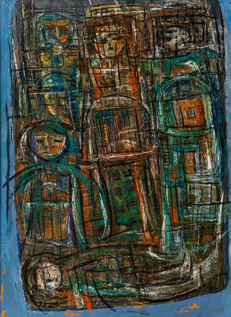 ويستطيع المتلقّي الاستمتاع بتأمل نتاج مرحلة المدينة في المعرض؛ فيشاهد مجموعة من البيوت والشرفات المتحرّكة، ذات العيون والنظرات اليقظة، والتي يبدو داخلها الناس كأنهم خشب.