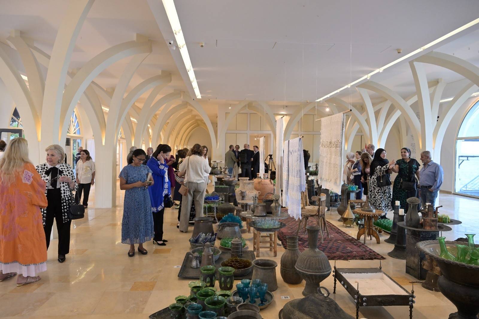 ويتضمن المعرض قطعاً حرفية تتراوح بين المنسوجات والزجاج المنفوخ، والفخاريات، والنحاسيات... وغيرها.