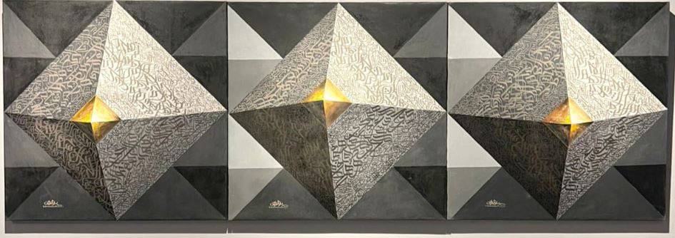 «تعكس لوحات المعرض رحلة ممتدة لأكثر من 40 عاماً، استلهمت خلالها سوراً من القرآن الكريم، أو الحديث الشريف أو الأشعار والحِكَم والأقوال المأثورة، أو تكوينات من الحروف والكلمات ذات الدلالات السامية مثل كلمات: حب، سلام، عشق»، وفق تصريحات يسري المملوك، مضيفاً لـ«الشرق الأوسط»: «من تلك الأعمال لوحة (3 نقاط 3 أهرامات) بألوان الزيت والأكريليك على القماش المجهز، وتمثل فيها كل نقطة خطية (المربع المائل) شكل الهرم بمنظور عين الطائر، لتعطي بعداً ثالثاً يستدعي في ذاكرتنا عمق الحضارة المصرية القديمة وعظمتها».