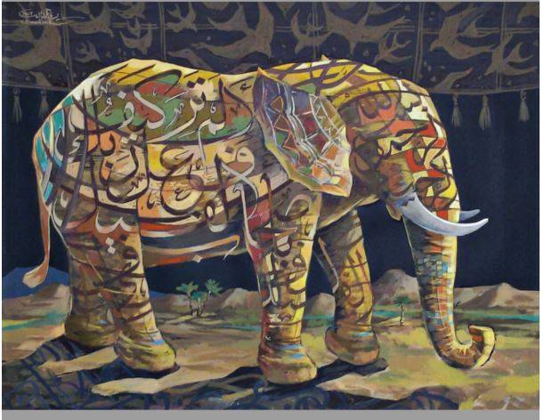يمزج الفنان في لوحاته الحروفية بين جماليات الحروف الكلاسيكية وثراء التشكيل والتصوير وفق المدارس الفنية المعاصرة، ومن الأعمال البارزة في المعرض لوحة من وحي الآية 40 من سورة يس «وكل في فلك يسبحون» 360×210 سنتيمتر التي استغرق تنفيذها 3 أشهر، وفق قوله. موضحاً أنها «تجمع بين قوة التكوين وبلاغة التعبير عن مضمون الآية وتنوع الخطوط العربية في أشكالها وجمالها وأحجامها، واختزال الألوان لتكون بالأبيض والأسود كالليل والنهار، بالإضافة إلى البني والرمادي، ومن جانب آخر تعبر الخطوط المنحنية وأجزاء من الدوائر عن الكواكب».