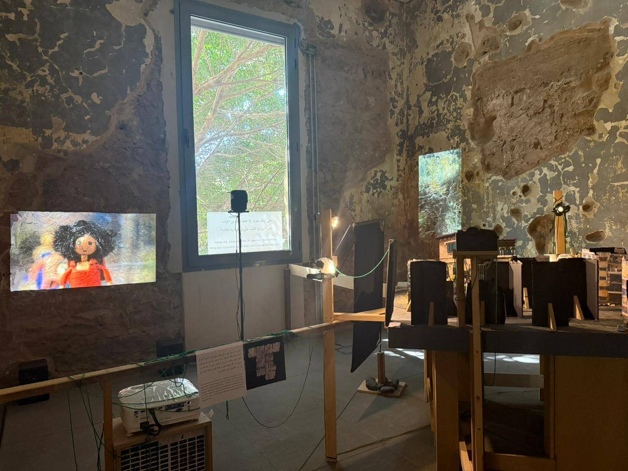 على الشاشات، مَشاهد من الفيلم الوثائقي «بيت الذاكرة» لكريستوفر ميتشل، تُسجّل اللحظات الأولى التي دخلت فيها المعمارية والناشطة منى الحلاق إلى المبنى، وبدأت تدرك أنّ هذا المكان شهادة ينبغي إنقاذها. وعلى شاشة أخرى، لقطات نادرة من «الخطّ الأخضر» لباسل حجيج وماريا شختورة، تُوثّق الدمار في الحيّ خلال الحرب.