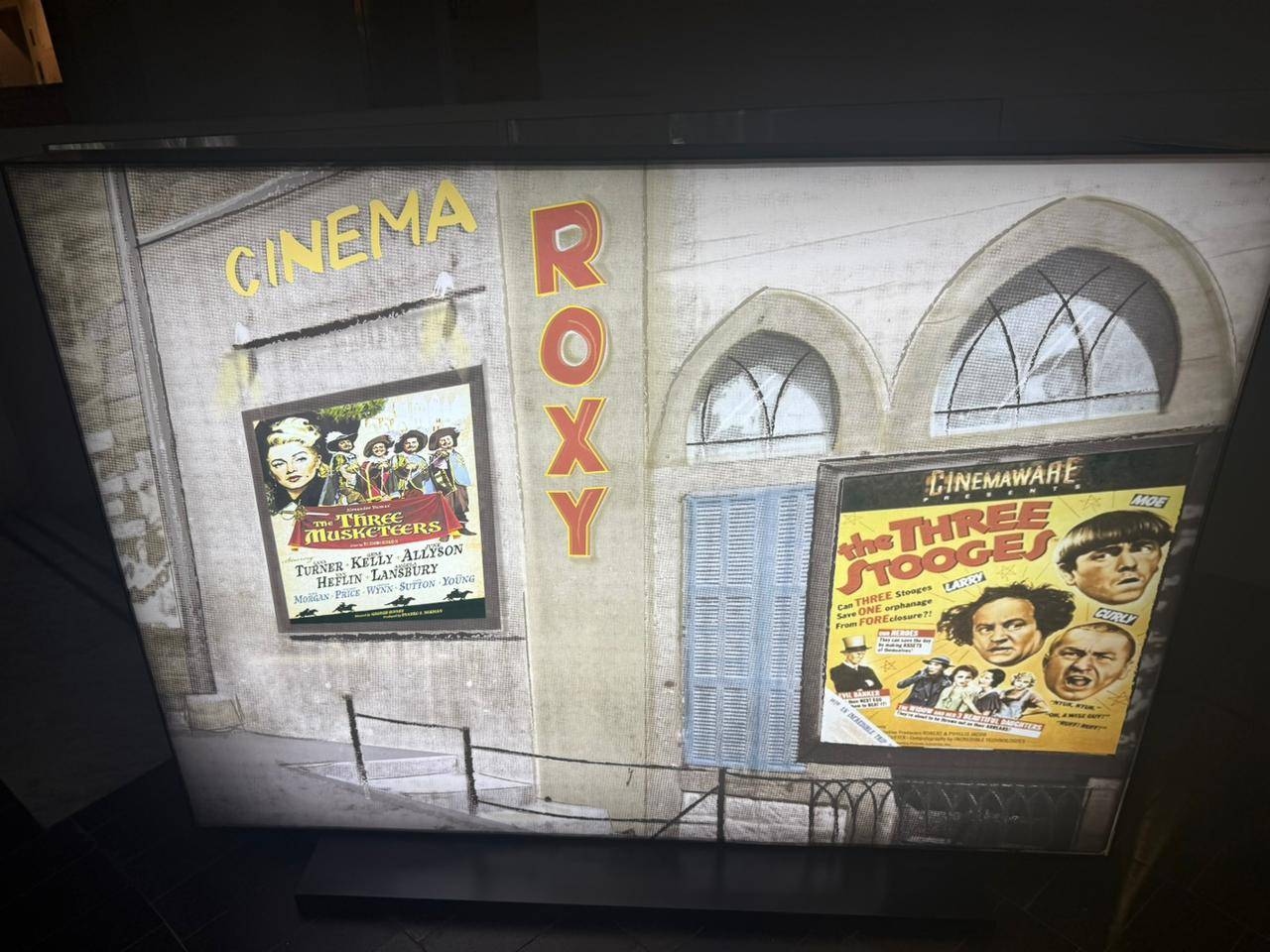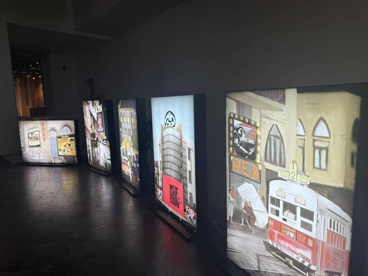إلى جانب ذلك، نُشاهد ألواحاً مُضيئة تُصوّر بيروت سينمائيةً، في صالات: «روكسي» و«ريكس» و«إمباير»، بواجهاتها وأسقُفها النيونية وإعلانات الأفلام. الواجهات المُعاد تركيبها استعادةٌ لذاكرة المدينة نفسها. ليست ذاكرة الرصاص، وإنما ذاكرة القدرة على الحياة.