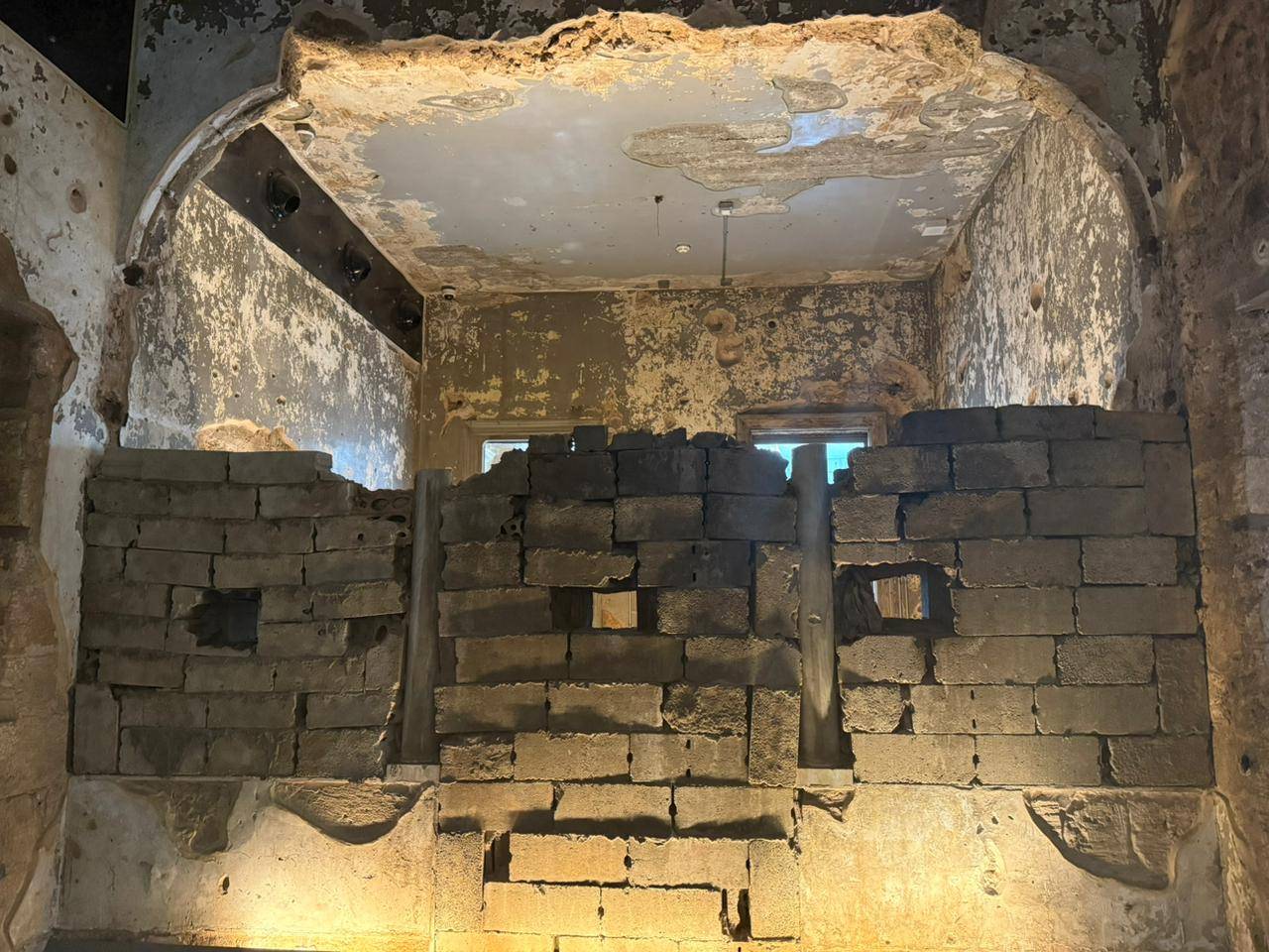 لكن «احكيلي» لا يكتفي بالعاطفي والحميمي. الصعود إلى الطابق الأول هو الدخول في قلب العطب. الجدران لا تزال مثقوبة. الأسمنت متآكل. فتحات القنص نائمة، لكنها موجودة. في إحدى الغرف، صفوف من حجارة البلوك السوداء تصنع متراساً داخلياً، مما يُذكّر بأنّ المبنى كان آلة قتل فعّالة على خطّ التماس. هنا، العمارة تتحوّل إلى وثيقة جريمة.