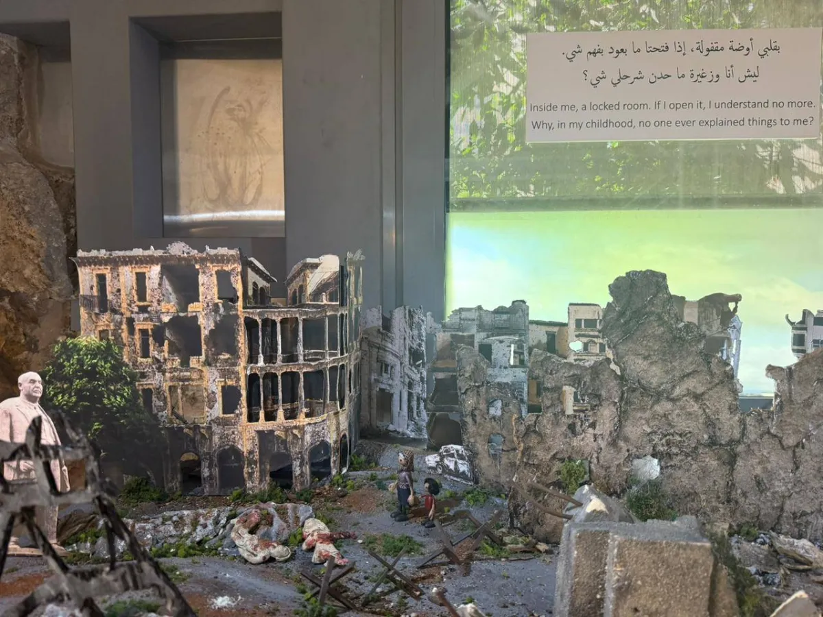 إحدى التركيبات الأكثر حزناً وجرأة هي «بين عالمين» لفيدا بزري وسيلفي باليو. نرى مجسَّمات أحياء مُهدّمة وشوارع محروقة وبقايا مبانٍ متروكة، مع شخصيات صغيرة تمثّل أطفالاً وناجين. وفي أحد النصوص المكتوبة داخل العمل، تقول الراوية: «بقلبي أوضة مقفولة... ليش أنا وزغيرة ما حدا شرحلي شي؟». هذا سؤال جيل كامل وُلد مع الحرب أو بعدها بقليل، لكنه كبُرَ من دون أن يحصل على رواية واضحة عمّا حدث.