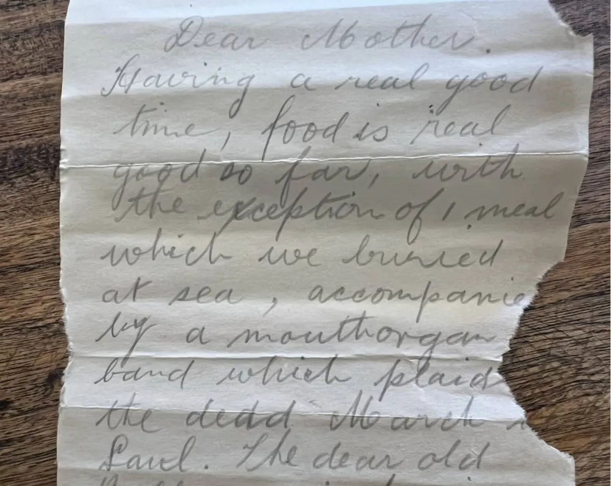 الرسالة التي استُخرجت من داخل زجاجة من نوع «شويبس» (Schweppes)، كُتبت بخط يد الجندي وجاء فيها قوله: «أقضي وقتاً رائعاً بالفعل. الطعام جيد جداً حتى الآن، باستثناء وجبة واحدة دفناها في البحر».