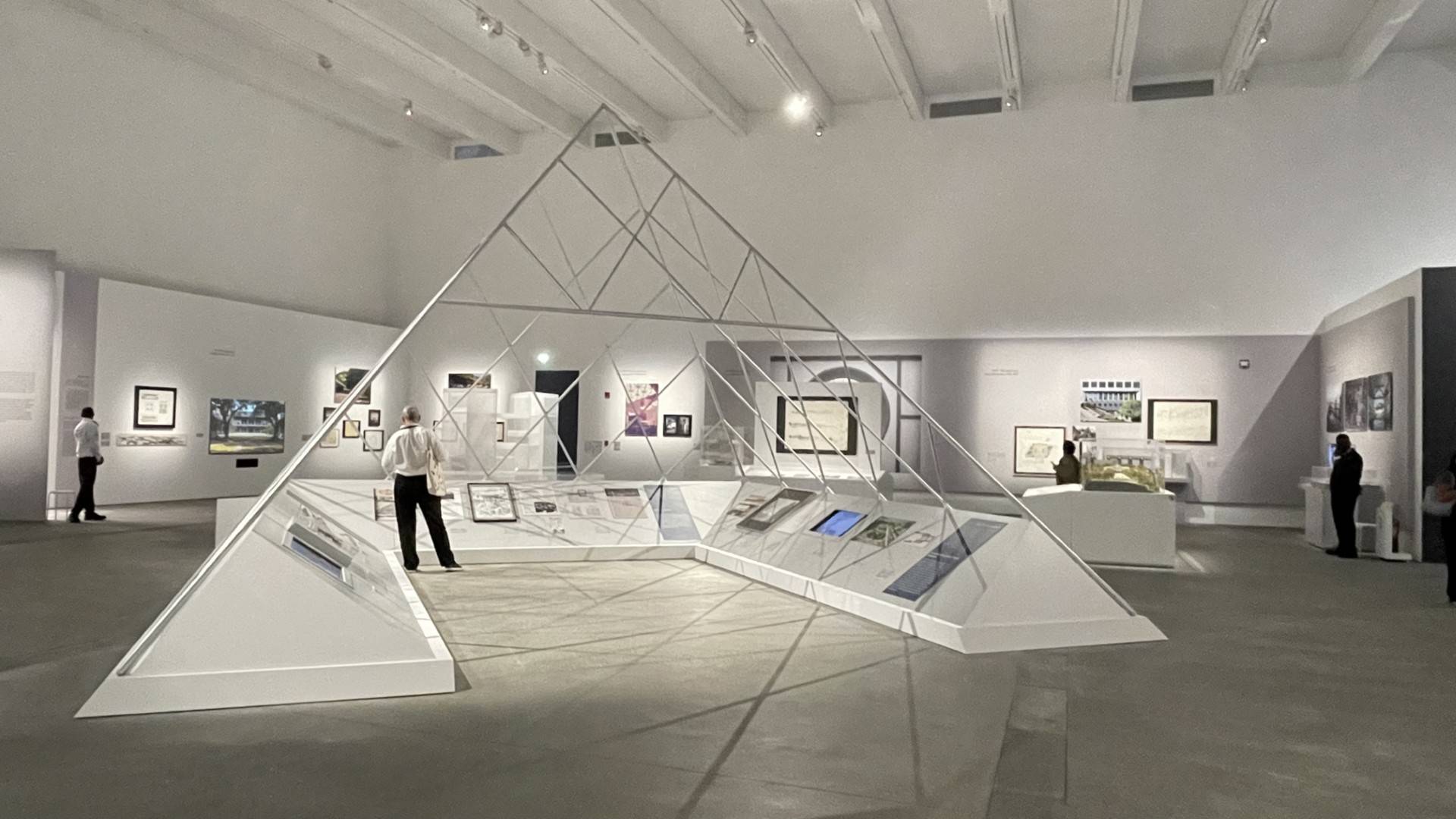 في المعرض الاستعادي نرى جانباً من عملية تصميم المتحف الإسلامي، ولكن هناك أيضاً جناح خاص لتصميم الهرم الزجاجي لمتحف اللوفر في باريس.