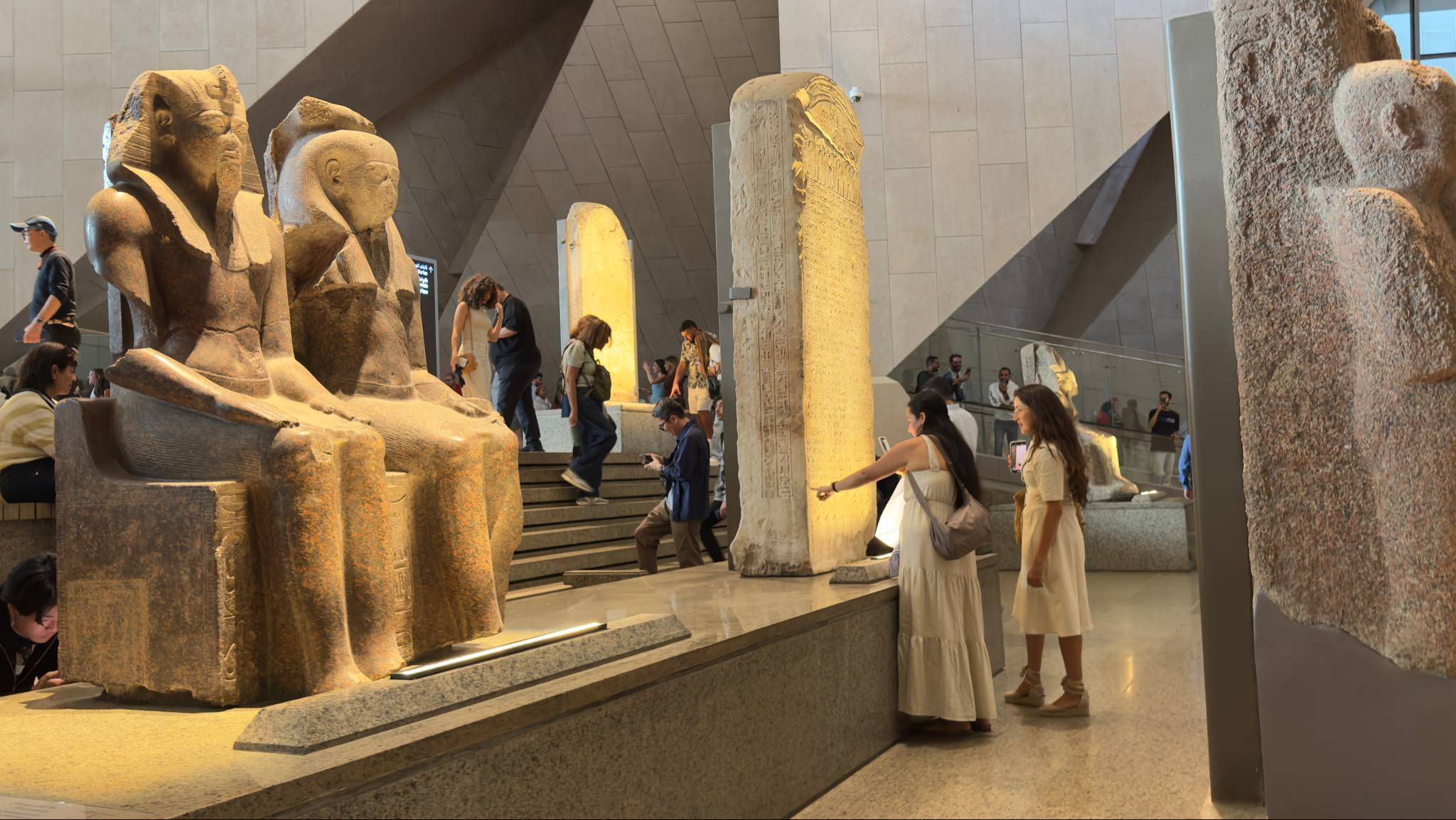 وامتزجت أصوات المرشدين السياحين بتعبير مصريين وعرب وأجانب عن إعجابهم الكبير واندهاشهم بالمتحف الجديد وضخامته، لا سيما بعد الوصول إلى الدرج العظيم الذي يضم 59 قطعة أثرية تزين درجاته وتأخذ الزائر في رحلة استكشافية عبر الزمن، وينتهي الدرج بإطلالة خلابة على أهرامات الجيزة.