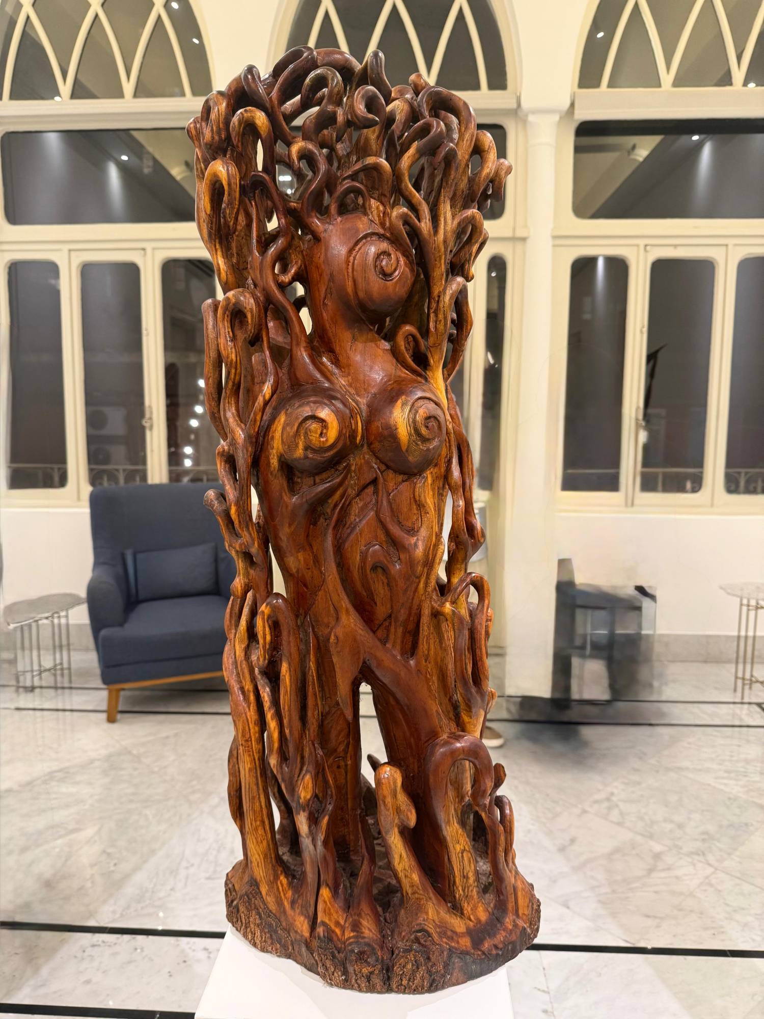 الخشب هو البطل الذي يشيخ ويُصقل. لمعانه طبقة ذاكرة تُظهر مسارب العروق وتُثبّت تاريخ الشجرة في هيئة جديدة. الانحناء هنا حركة شكلية وأيضاً فكرة أخلاقية وجمالية. فالأعمال تُمسك الغريزة وتُروّضها، وتُحيل الفورة إلى رقصة، وتُصغي للثقل كي يتوازن ولا يقع.