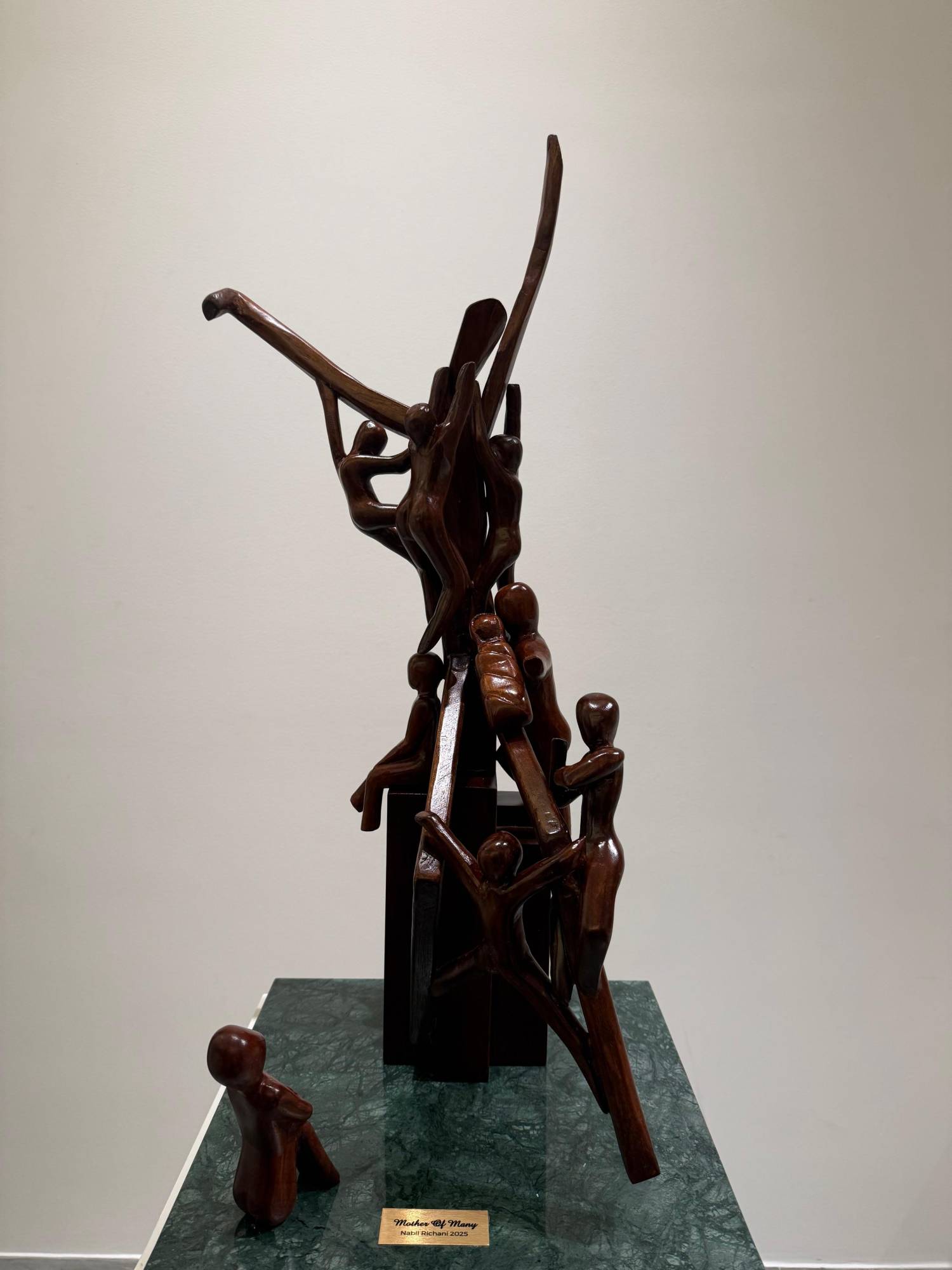 قطعٌ أخرى تحمل مزاج النجاة. أشكال بشرية مُختزَلة ورؤوس بيضوية وأجساد رشيقة تتسلَّق كتلة عمودية، تصنع سلَّماً من أجسادها وتترك فراغاً لإنسان يتأمّل من بعيد. الحركة عند ريشاني جماعية بقدر ما أنها فردية، والنجاة لا تُنجزها ذراع واحدة. اليد تمتدّ إلى يد والخطّ يصير مساراً. حكاية طبقات تتآزر كي لا تسقط.