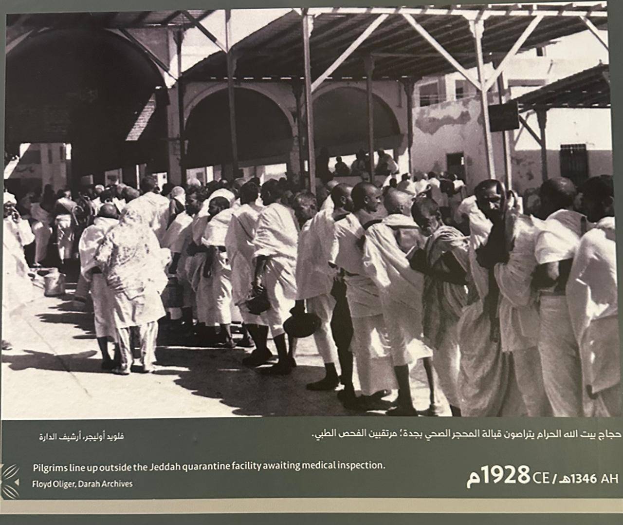 في ممر آخر، تتوالى الوثائق لتروي كيف بدأ اهتمام المملكة بصحة الحجاج قبل قرن من الزمان. تُعرض وثيقة صادرة عن الملك عبد العزيز عام 1925 تأمر بإجراء الفحص الطبي الفوري للحجاج الآتين عبر الموانئ، وصورة أخرى تُظهر المحجر الصحي في جدة عام 1928.