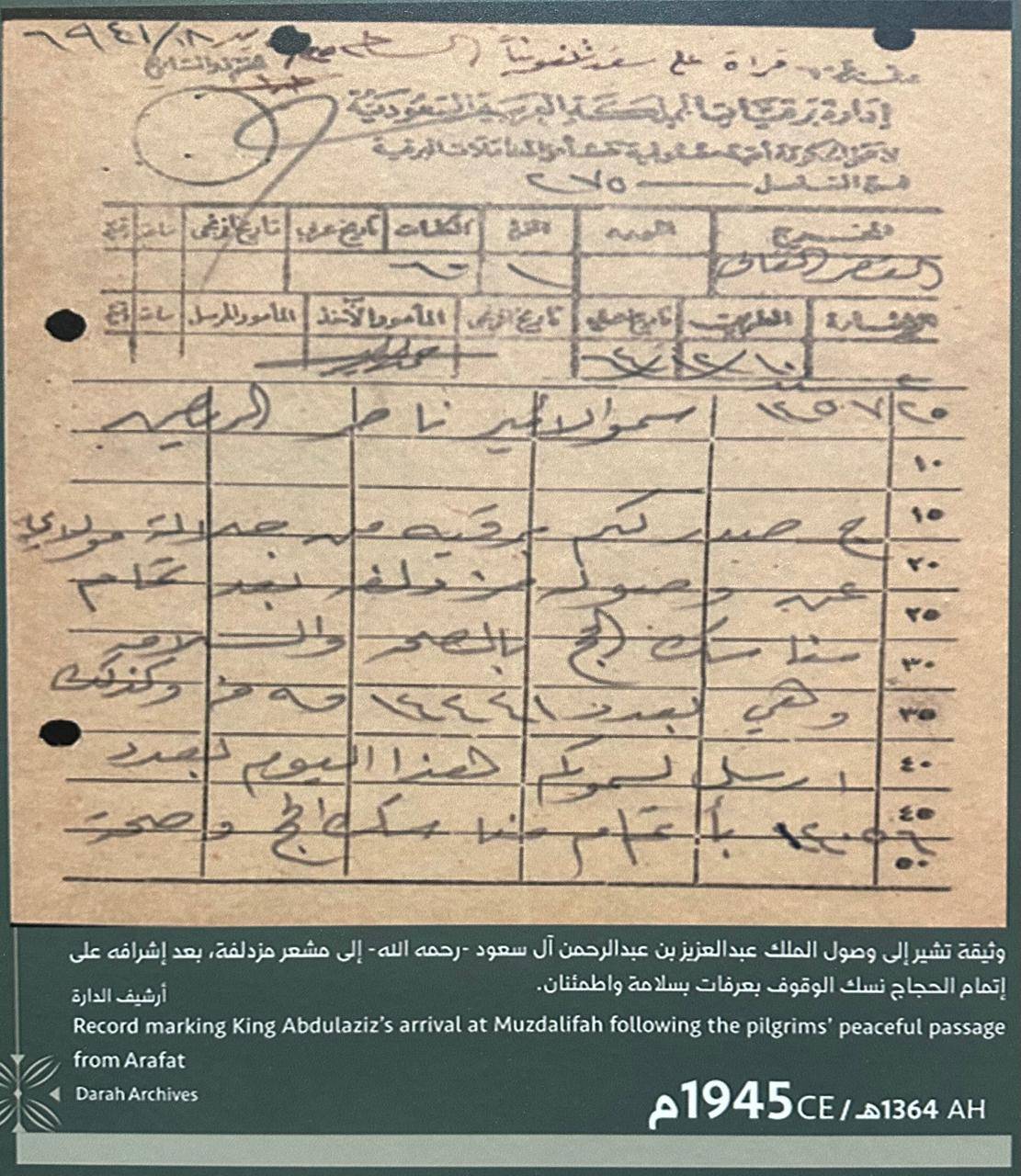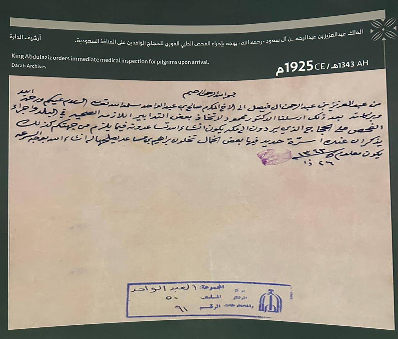إحدى الوثائق النادرة المعروضة تعود إلى عام 1926، تكشف عن متابعة الملك المؤسس، عبد العزيز بن عبد الرحمن آل سعود، الدقيقة لشؤون الحجاج، وحرصه على أمنهم وسلامتهم خلال أداء المناسك.