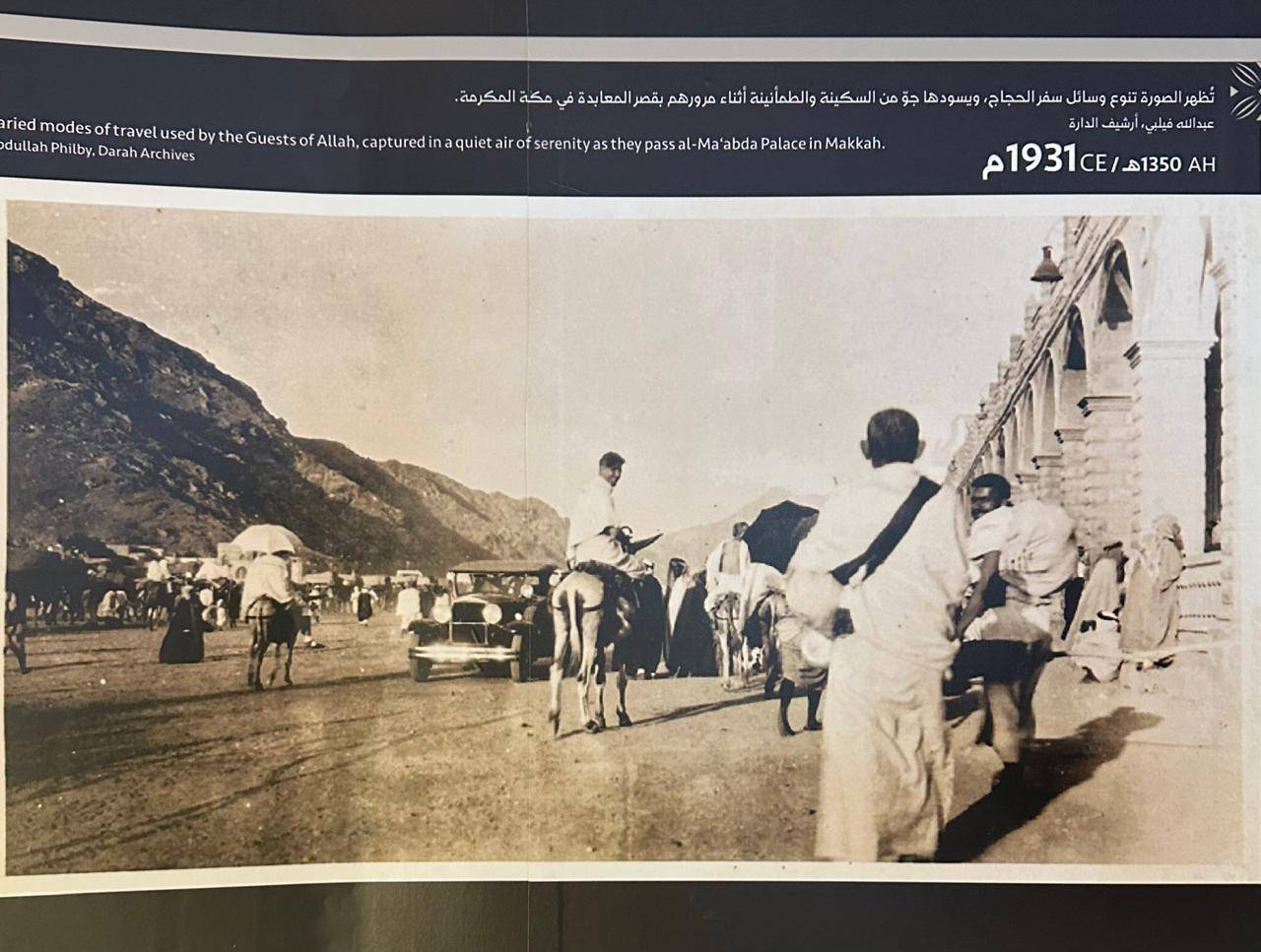 إلى جوارها، صور التقطها الرحالة عبد الله فيلبي عام 1930 تُظهر قوافل الحجاج عند مِنى، تليها لقطات دخول السيارات إلى مكة المكرمة أول مرة، ومن ثَمَّ صور الحافلات المخصصة لنقل الحجاج في خمسينات القرن الماضي، وصولاً إلى «قطار الحرمين الشريفين» في عهد الملك سلمان بن عبد العزيز، الذي اختصر المسافات وجسَّد حداثة خدمة الحج.