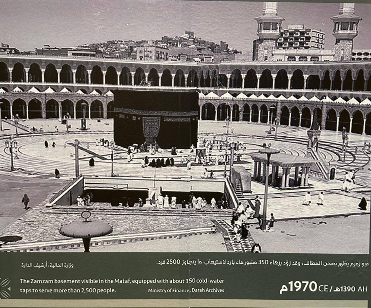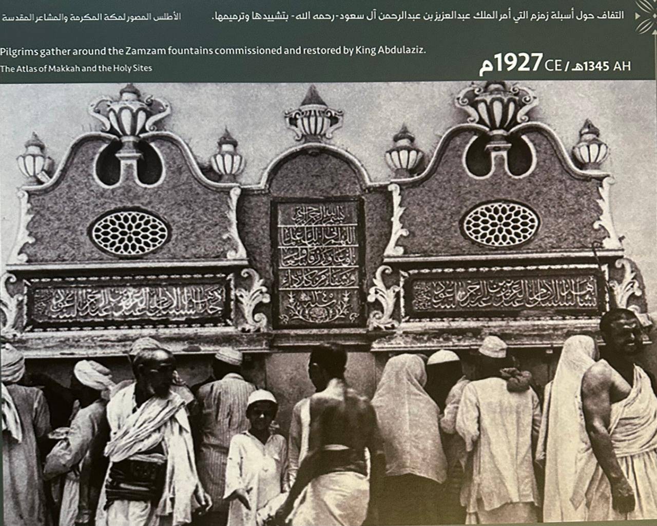 في زاوية مضاءة بلون أزرق مائل إلى صورة النور، تتدلّى خريطة قديمة لـ«عين زبيدة»، وتحتها وثيقة ممهورة بأمر ملكي من الملك عبد العزيز بإنشاء سبيل داخل المسجد الحرام لسقيا الحجاج والمعتمرين.