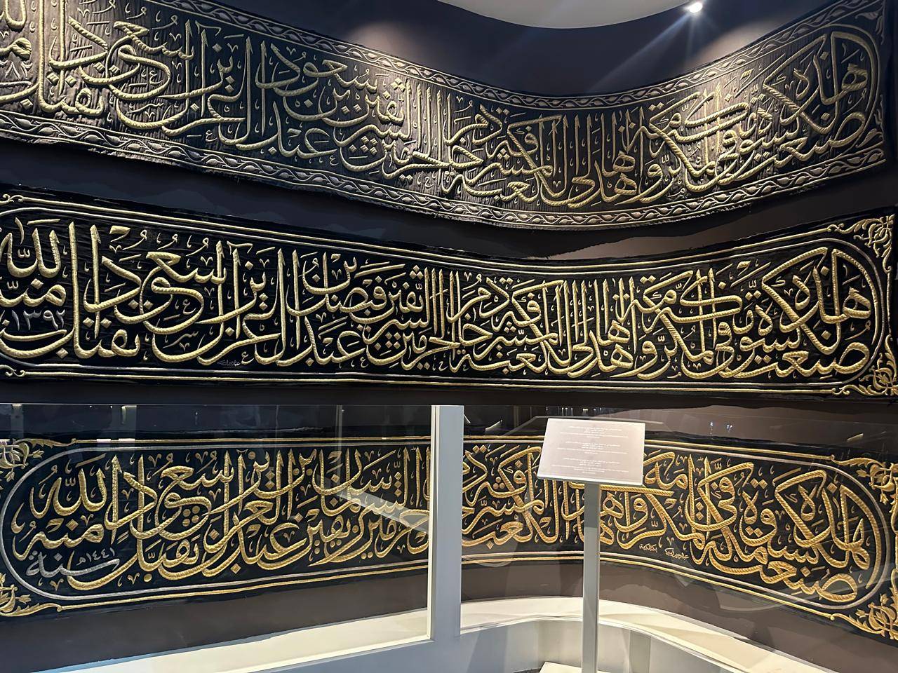 وإلى جوارها الكسوة الداخلية التي صُنعت في عهد الملك خالد، ثم أحزمة الكعبة المطرزة بأسماء الملوك؛ من الملك سعود إلى الملك فيصل، وصولاً إلى الكسوة التي نُسجت عام 1441هـ في مصنع «أم الجود» بمكة المكرمة.