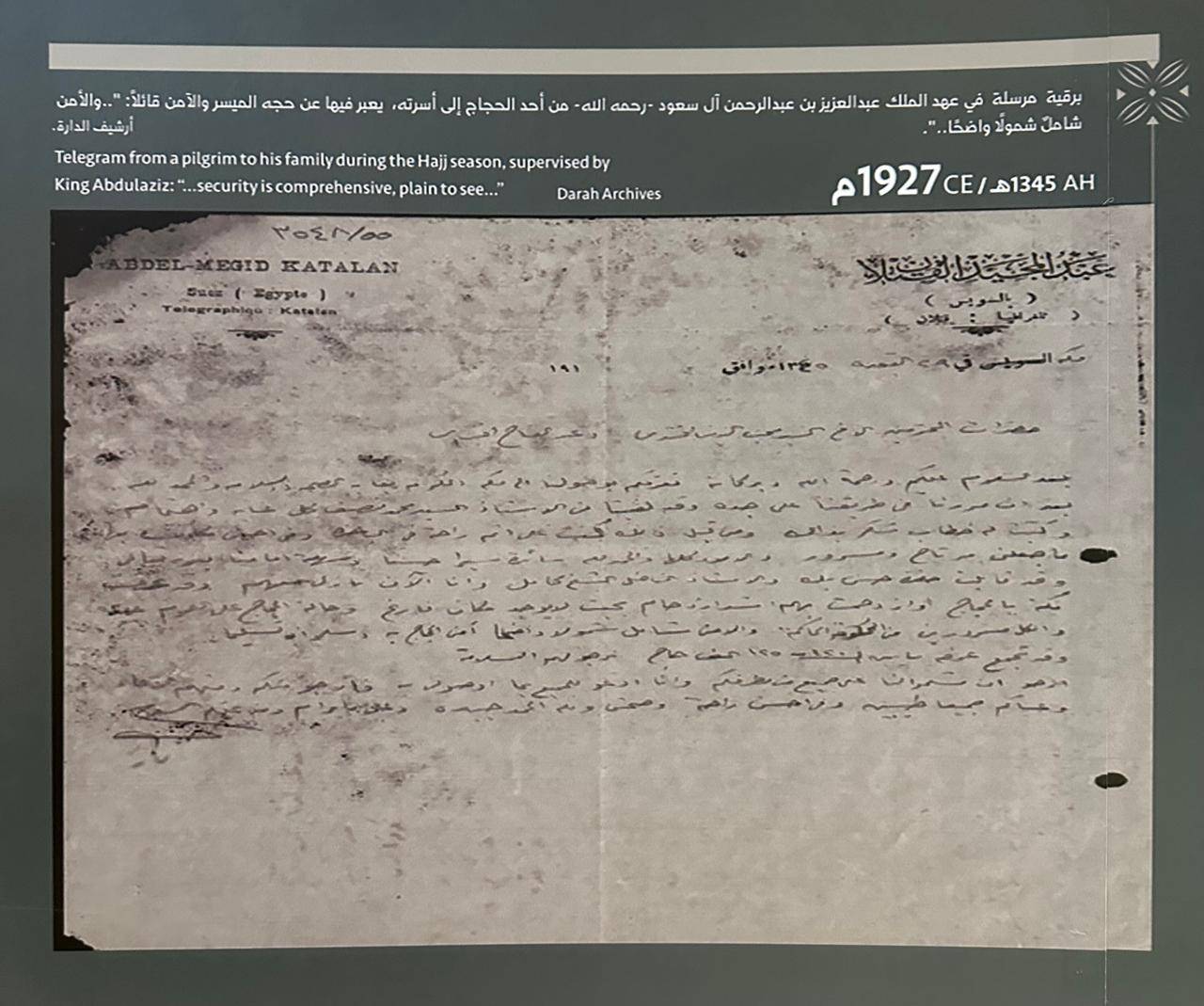 في زاوية خافتة، تتدلّى وثيقة صغيرة بخط اليد... هي برقية أرسلها أحد الحجاج عام 1927 إلى أسرته، يخبرهم فيها أنه «أدَّى النسك في يسر وأمان»... جملة قصيرة، لكنها تختصر فلسفة المملكة في بناء منظومة أمن شاملة للحج منذ أيامها الأولى.