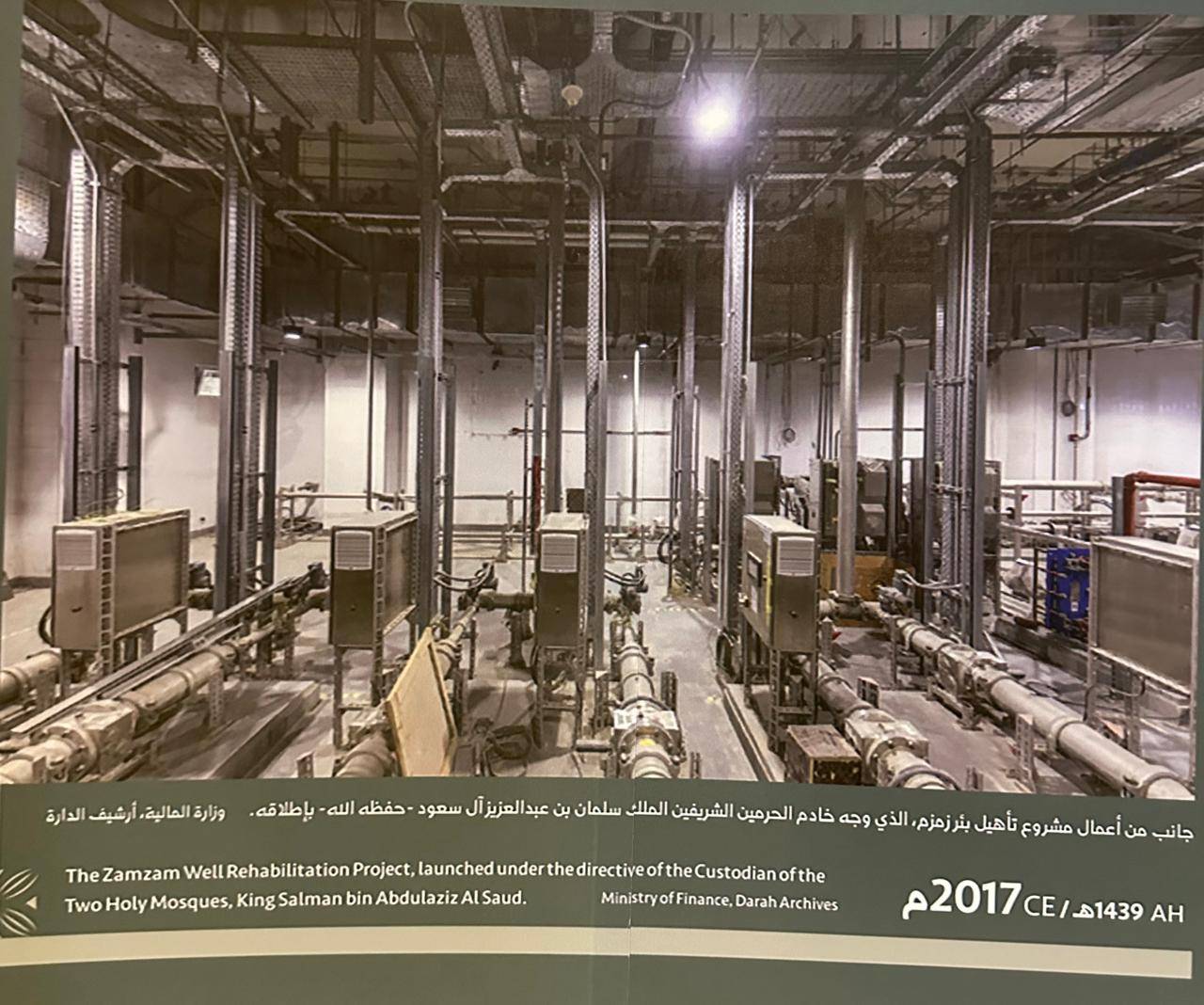 تحت الزجاج، يظهر مجسّم حديث يبرز خزانات التبريد والضخ الذكية التي تغذي المسجد الحرام بأكثر من 350 صنبوراً، بطاقة استيعابية تتجاوز نصف مليون حاج يومياً.