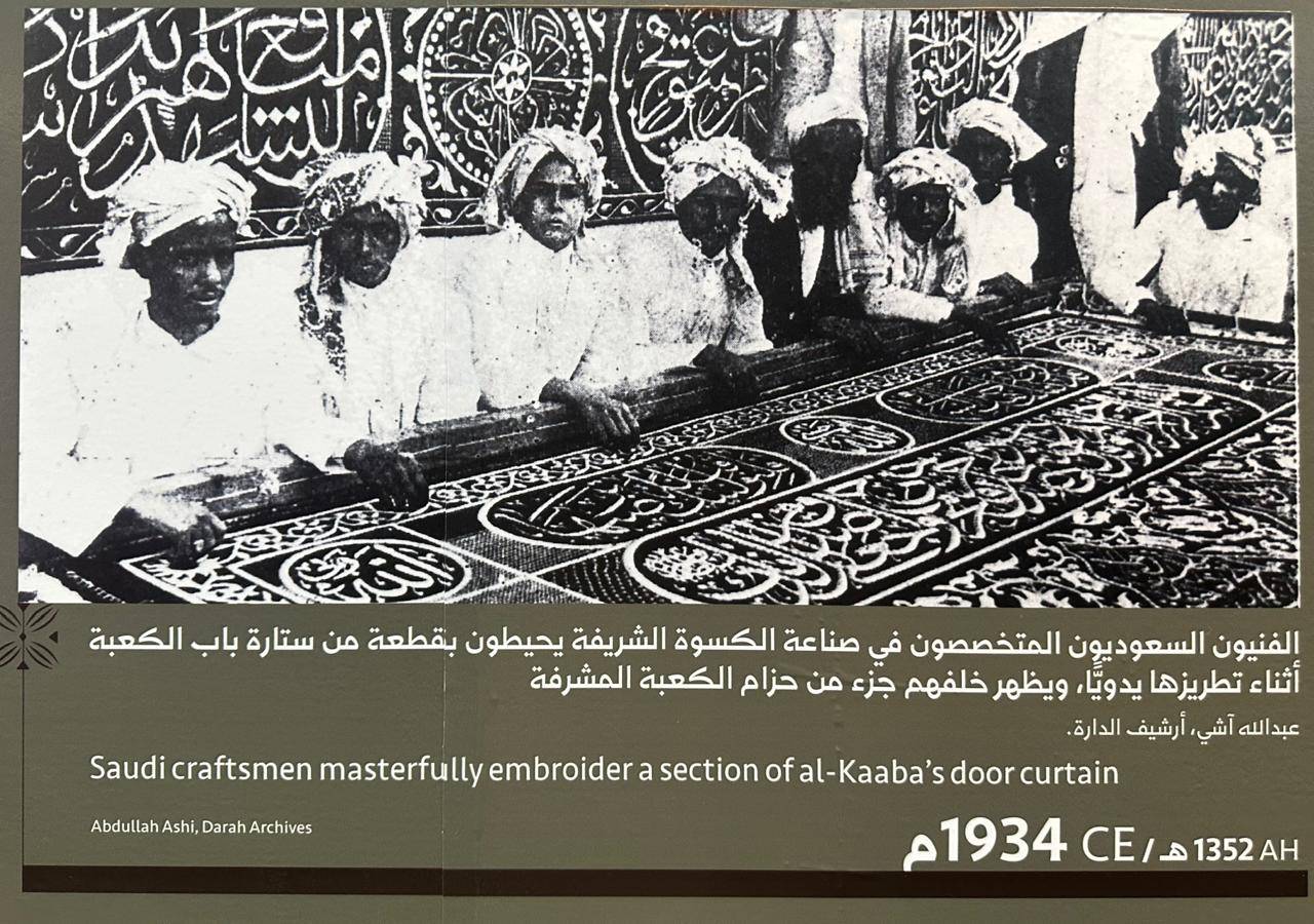 في القاعة الأخيرة، يهبط الضوء على حرير أسود تتلألأ عليه خيوط الفضة والذهب. هنا تُعرض ستارة باب الكعبة المشرفة التي أمر الملك عبد العزيز بصناعتها عام 1356هـ على أيدي الصناع السعوديين، إيذاناً ببدء عهدٍ جديد في صناعة الكسوة داخل المملكة.