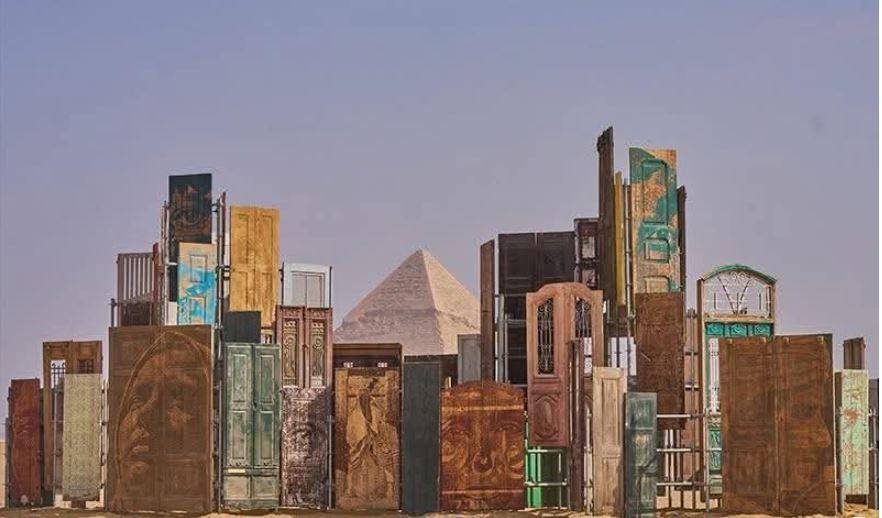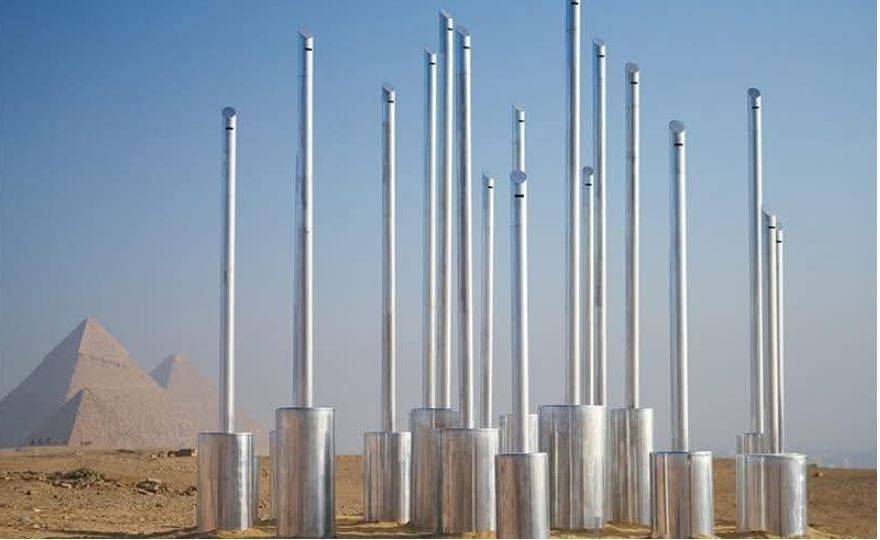 قطع خشبية جُمعت من شوارع القاهرة لتصبح عنواناً للإبداع، بعد أن كانت تقبع في مكبّ نفايات. رموز هندسية معلقة في الفضاء ترمز إلى الأبدية. أشكال معدنية من الأسطوانات والدوائر تعانق عبقرية القدماء. أهرامات معدنية تسعى لفك شفرة الخلود. أعمدة فضية تحاكي عظمة المعابد الفرعونية.