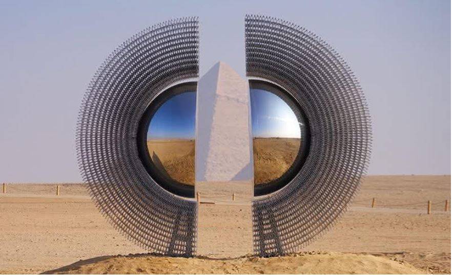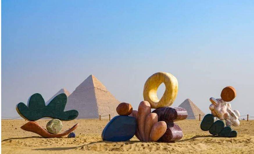 عبر 10 أعمال تتسم بالخروج عن المألوف، وهي تعانق الرمال الذهبية لصحراء الجيزة وتجعل من الدهشة أيقونة معلقة في الفضاء، بدا المعرض مشغولاً بهواجس الخلود ومحاورة التاريخ وخلق حوار ثقافي مع مجد القدماء، لتتعمق قيمة الحدث الذي تنظمه مؤسسة «أرت دي إيجيبت»، برئاسة نادين عبد الغفار، بوصفها نقطة التقاء بين الماضي والحاضر.