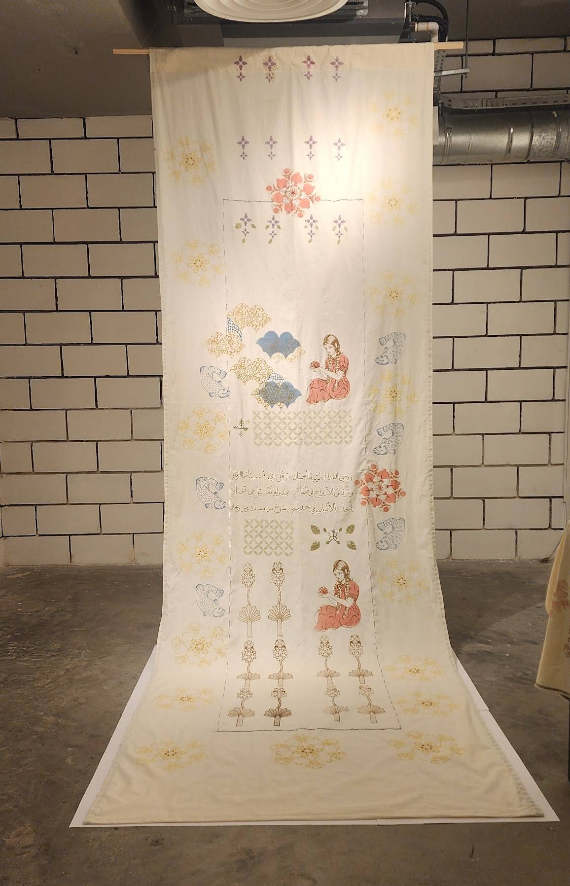 يتكون العمل من سجادة من قماش الكتان المصبوغ بالحنة والمطبوع بتقنية الطباعة الحريرية بأصباغ مستخلصة طبيعياً من ورد الرمان وقشوره والزعفران والنيلة، ومطرز بزخارف مستلهمة من النخيل والبساتين. وبسؤالنا عن العبارات التي ترافق أغلب أعمالها، توضح لنا أن النصوص تأتي لتكمل باقي أحداث قصتها، وهذه العبارات إما نثرية أو شعرية، وإما تكون من كتاباتها الشخصية أو من أبيات زوجها الشاعر.