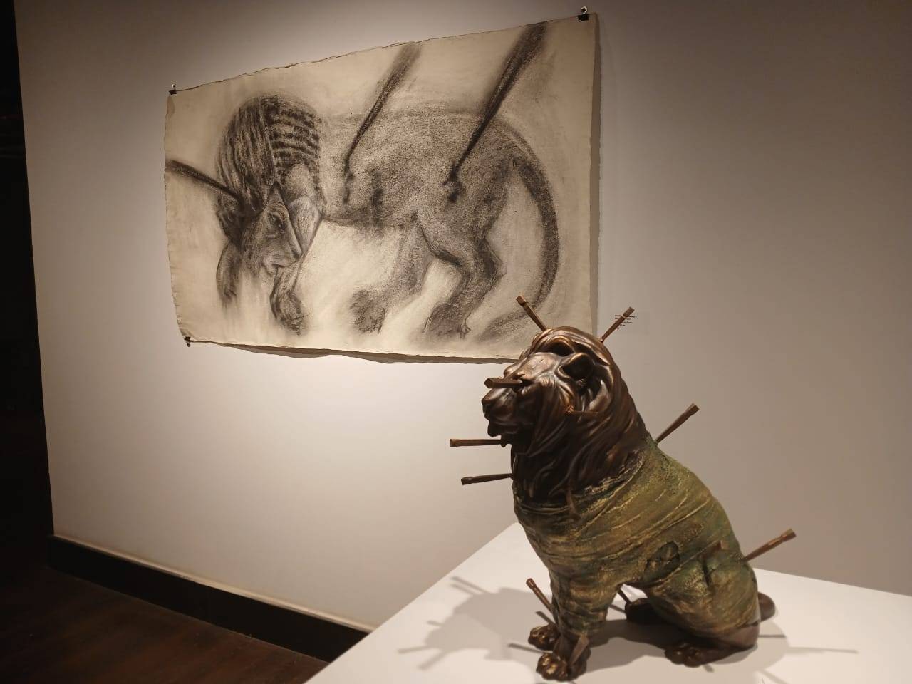 ويضم المعرض أيضاً أعمالاً نحتية توازي الأعمال الورقية، أبرزها تمثال أسد مستوحى من «أسدي قصر النيل» الشهيرين بالقاهرة، وإلى جواره يدوّن الفنان عبارة لافتة: «اكتشفت أن للغة العربية ما يقارب أربعمائة اسم للأسد، وكل اسم يحمل ظلاً لمعنى مختلف، ومنذ ذلك الوقت أصبح الأسد بالنسبة لي أكثر من تمثال؛ صار رمزاً لزمن، وحالة إنسانية تتكرر».