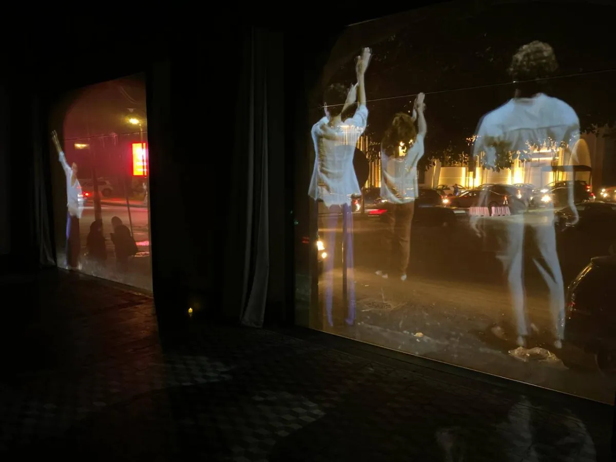 ثم يُسقِط المعرض على زجاج المبنى أجساداً تتحرَّك ببطء. رجال ونساء يظهرون مثل أطياف شفَّافة، كأنهم يخرجون من طبقة زمنية أخرى ليُخاطبوا المدينة المعاصرة. الانعكاس الذي تُحدِثه الإضاءة والمرور المتواصل للسيارات يجعل المشهد مُعلَّقاً بين الحياة والغياب. فمَن يؤدّون حركات تُشبه الاستغاثة أو محاولات العبور، يظلّون محبوسين خلف السطح الزجاجي الذي يفصلهم عن الضجيج الخارجي. هنا الماضي يقف عند الواجهة، يرفع يده، ويطلب أن نراه ولو على شكل طيف، عوض أن نطالبه بالخروج من المشهد.