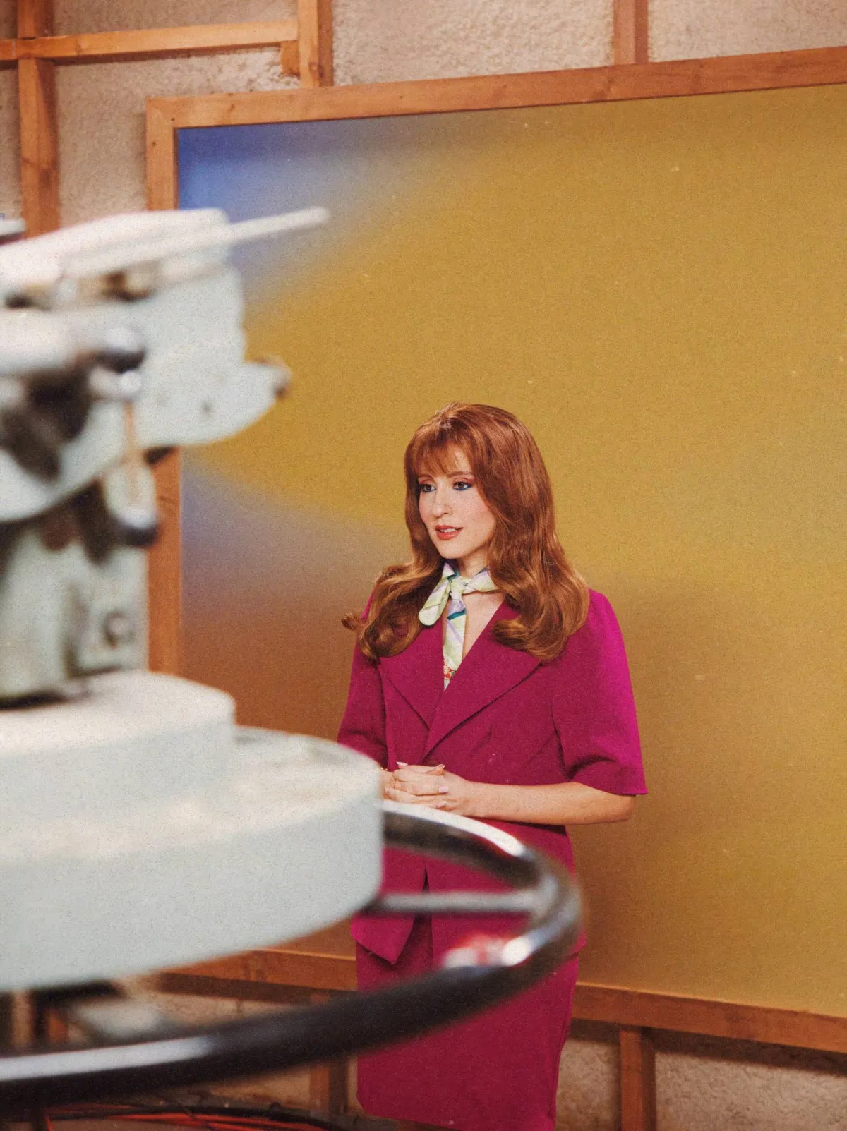 في الكليب، تُجسِّد شخصية مذيعة ربط الفقرات، المهنة التي اختفت مع التحوّل الرقمي. تربط بين البرامج وتغادر، ومع ذلك كانت عنصراً مألوفاً في المشهد اليومي للشاشة. «اتّسمت هذه الشخصية بحضور انعكس في إطلالتها وطريقة أدائها أمام الكاميرا»، تقول، مشيرةً إلى أنّ العودة إلى تلك الصورة تعكس قلقاً راهناً من التحوّلات التي يعيشها الإنسان اليوم، لا سيّما في ظلّ الذكاء الاصطناعي. فبرأيها، حمل الماضي منظومة قيم مختلفة، من لبنان وتلفزيونه، وصولاً إلى الإنسان المعاصر الذي بات أكثر عُرضة للتهديد.