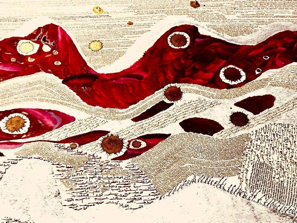 تتّسم هذه الأعمال المعروضة في غاليري «مايا آرت سبيس» بوسط بيروت ببنية مركَّبة تقوم على توازن دقيق بين النصّ والصورة. فالكتابة تُشكّل أرضية العمل وطبقاته الأساسية، فيما تتحرَّك فوقها عناصر تصويرية أو تجريدية تنشأ من اللون أو من التكوين الهندسي. هذا التداخُل يمنح اللوحات إحساساً بأنّ اللغة تتحوَّل إلى تضاريس بصرية أشبه بخرائط دقيقة تتكوَّن من آلاف العلامات الصغيرة.