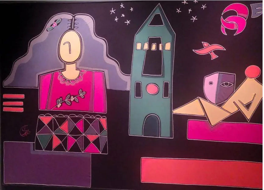 وتسيطر الأشكال الهندسية على لوحات المعرض، ويكاد يكون الخط المستقيم أو المربعات والمثلثات هي الأشكال الأكثر حضوراً، على الرغم من احتفاء الفنانة بعناصر من الطبيعة من نباتات وطيور وأشجار وبحار وغيرها، ولكن تظهر الطبيعة الصامتة في لوحات عدة تُقدمها الفنانة بأسلوبها المميز الذي يمزج بين عدة مدارس فنية.