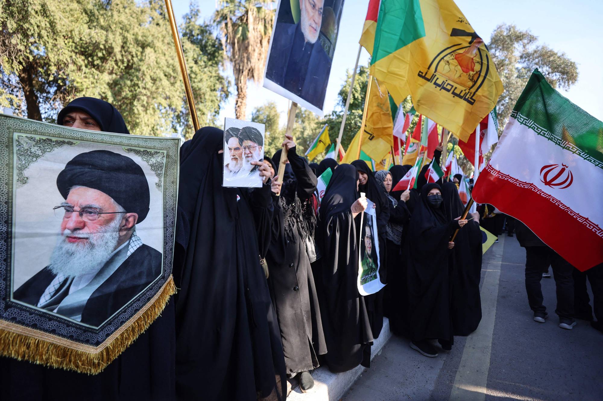 عراقيون يحملون علم إيران وشعار «كتائب حزب الله» وصورة خامنئي خلال مظاهرة في بغداد (أ.ف.ب)