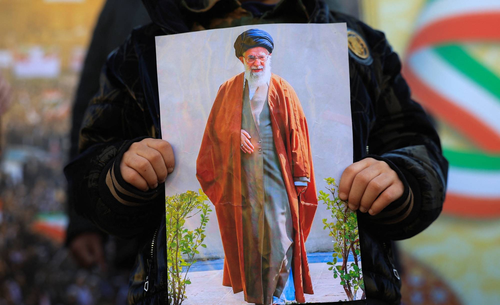 صبي عراقي يحمل صورة خامنئي خلال مظاهرة في بغداد لدعم النظام الإيراني (رويترز)