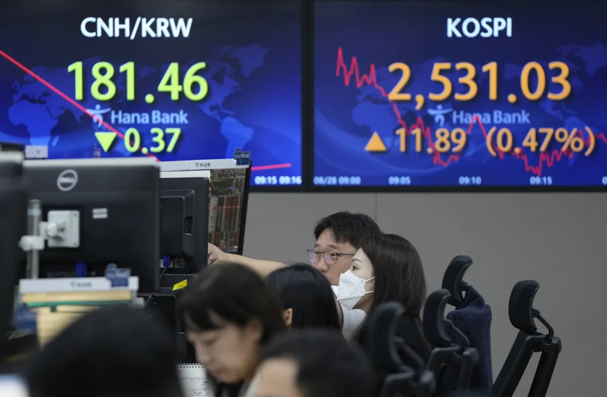متداولو العملات يشاهدون شاشات بالقرب من الشاشات التي تعرض مؤشر أسعار الأسهم الكورية المركب (KOSPI) أعلى اليمين في غرفة تداول العملات الأجنبية في المقر الرئيسي لبنك KEB Hana Bank في سيول كوريا الجنوبية (أ.ب)