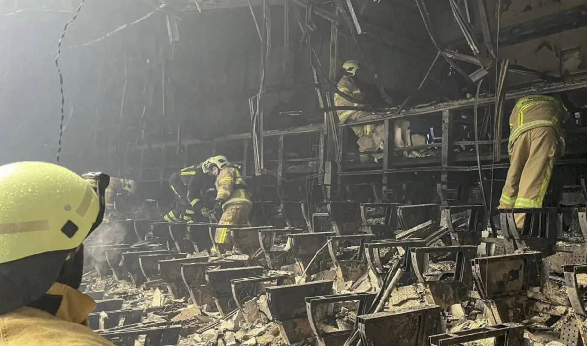 صورة ثابتة مأخوذة من مقطع فيديو أتاحته وزارة الطوارئ الروسية تظهر رجال الإنقاذ وهم يفحصون الحطام في القاعة المحترقة في قاعة الحفلات الموسيقية Crocus City Hall (إ.ب.أ)
