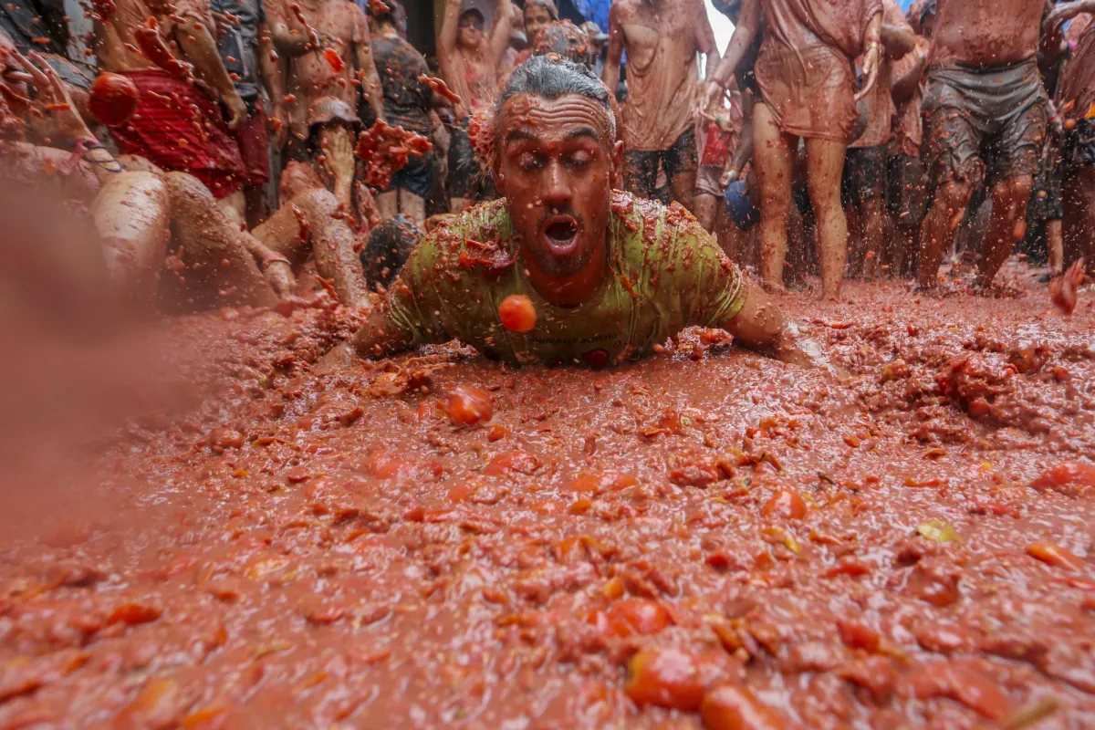 تجذب «أكبر معركة طعام» في العالم الآلاف من السياح إلى بلدة بونول في إسبانيا، حيث يرمي المشاركون الطماطم على بعضهم بعضاً؛ ما يخلق لوحة حمراء غريبة من نوعها.