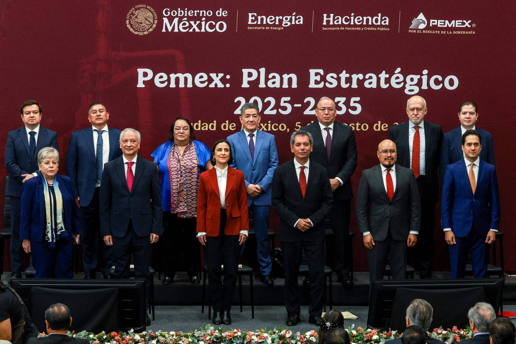 صورة جماعية لوزراء ومسؤولين في «بيميكس» خلال فعالية لتقديم خطة تهدف لتعزيز الشركة (رويترز)