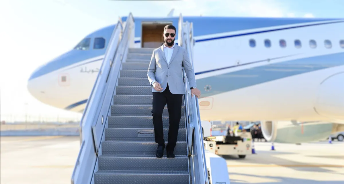 الرئيس السوري أحمد الشرع يهبط على سلم الطائرة (الرئاسة السورية)