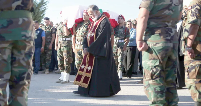رجل دين مسيحي يقود جنازة إيلي فريجة في بلدة رعيت البقاعية والذي قتل في معارك الجيش اللبناني ضد داعش (أ.ف.ب)