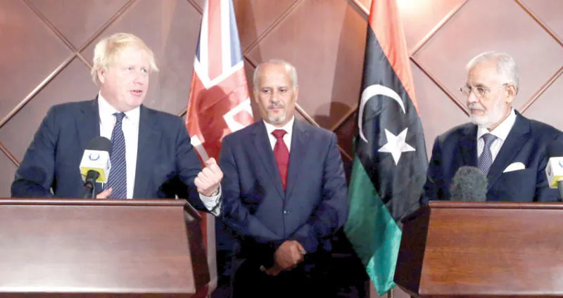 وزير الخارجية البريطاني بوريس جونسون خلال مؤتمر صحافي مشترك مع وزير خارجية حكومة الوفاق الوطني محمد طاهر سيالة في طرابلس أمس (أ.ف.ب)