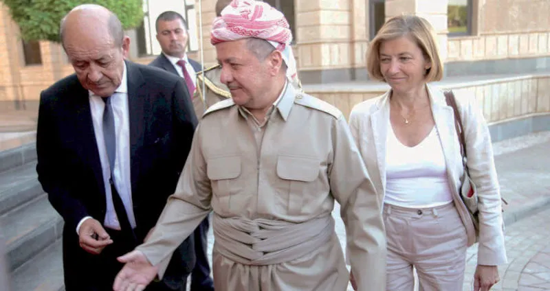 رئيس إقليم كردستان مسعود بارزاني لدى استقباله وزيري الخارجية الفرنسي جان إيف لو دريان والدفاع فلورنس بارلي في أربيل (رويترز)