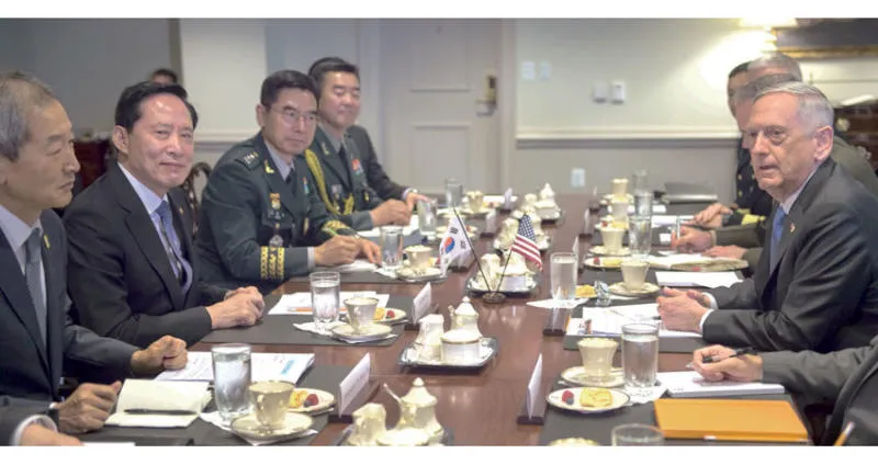 وزير الدفاع الأميركي (يمين) ونظيره الكوري الجنوبي خلال اجتماع في مقر البنتاغون أمس (أ.ف.ب)