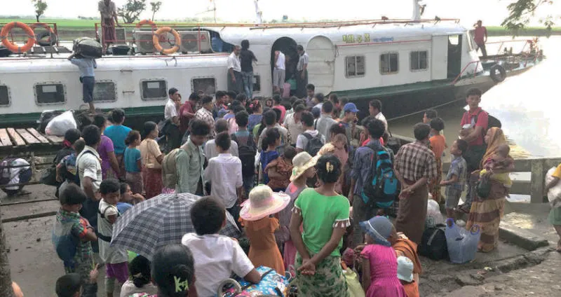 مجموعة من الروهينغا تستقل قارباً هرباً من أعمال العنف في ولاية راخين (أ.ف.ب)