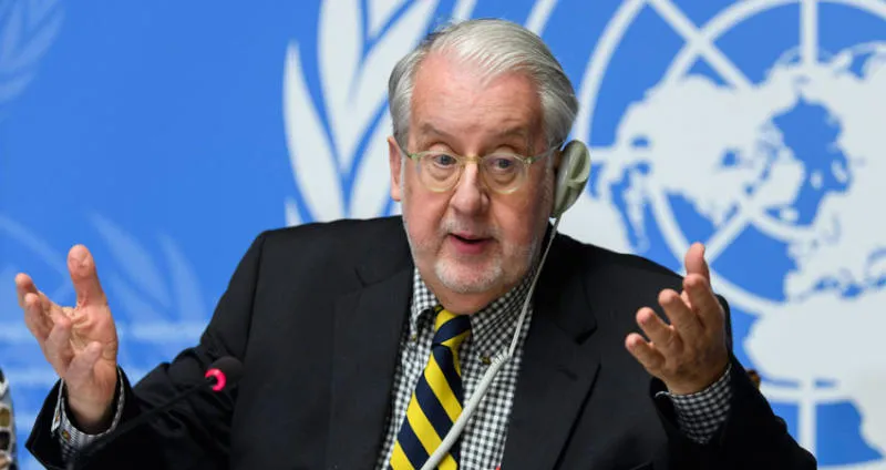 رئيس لجنة التحقيق التابعة للأمم المتحدة باولو بينهيرو خلال إعلان نتائج التقرير في جنيف أمس (إ.ب.أ)