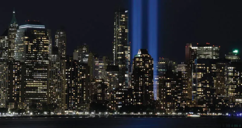 علامتان ضوئيتان مكان برجي مركز التجارة العالمية في نيويورك خلال الاحتفال بذكرى مرور 16 سنة على هجمات 11 سبتمبر 2001 (إ.ب.أ)