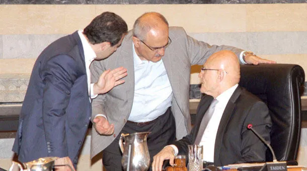 رئيس الحكومة تمام سلام في حديث مع الوزيرين علي حسن خليل ووائل أبو فاعور أثناء اجتماع للحكومة أمس (دالاتي ونهرا)