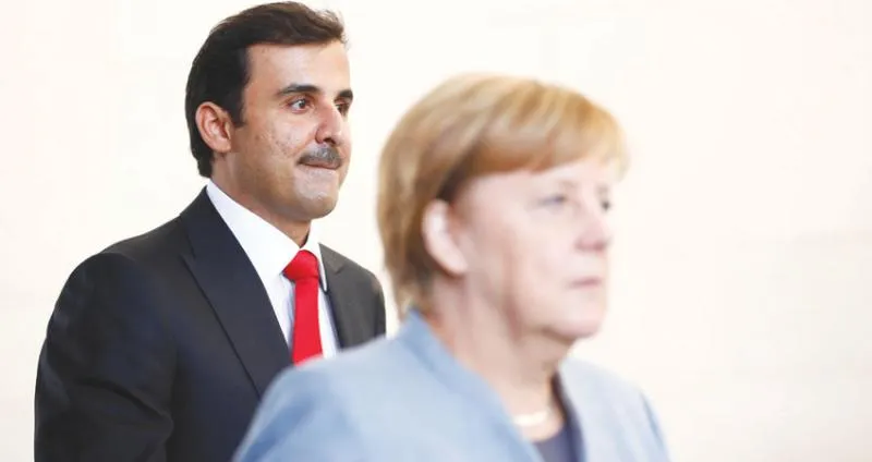 انغيلا ميركل خلال لقائها الشيخ تميم في برلين امس (رويترز)