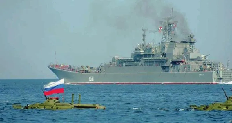 سفينة الإنزال الروسية «يامال» لدى عبورها البوسفور أمس (قناة روسيا اليوم)