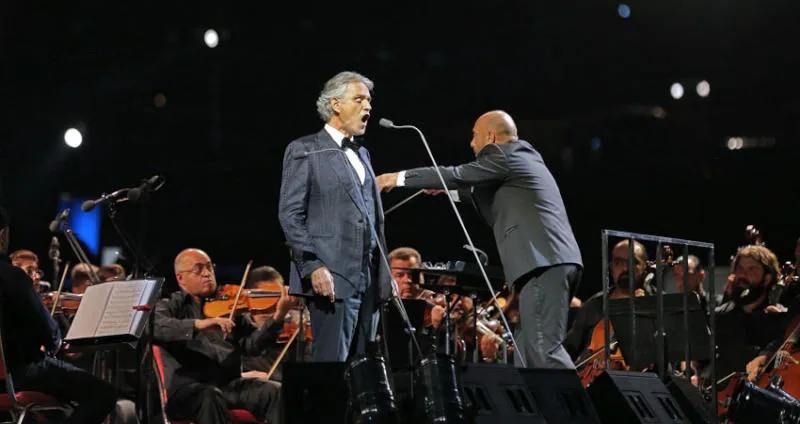 واستمع الجمهور الذي غصت به ساحة الأعمدة إلى أهم المقطوعات التي غناها الفنان بوتشيلي خلال مسيرته الفنية، التي سجل خلالها 15 ألبوماً منفرداً من الموسيقى الكلاسيكية والمعاصرة، و3 ألبومات لأغانيه المفضلة، و9 ألبومات أوبرا كاملة، بيع منها أكثر من 80 مليون نسخة في جميع أنحاء العالم.