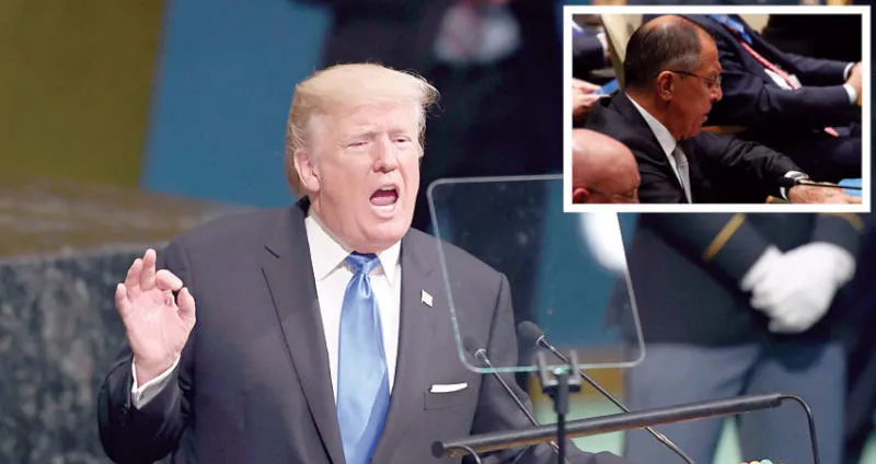 ترمب يتحدث أمام الجمعية العامة للأمم المتحدة أمس (أ.ف.ب) ... وفي الإطار وزير الخارجية الروسي ينظر في ساعته خلال الخطاب (رويترز)